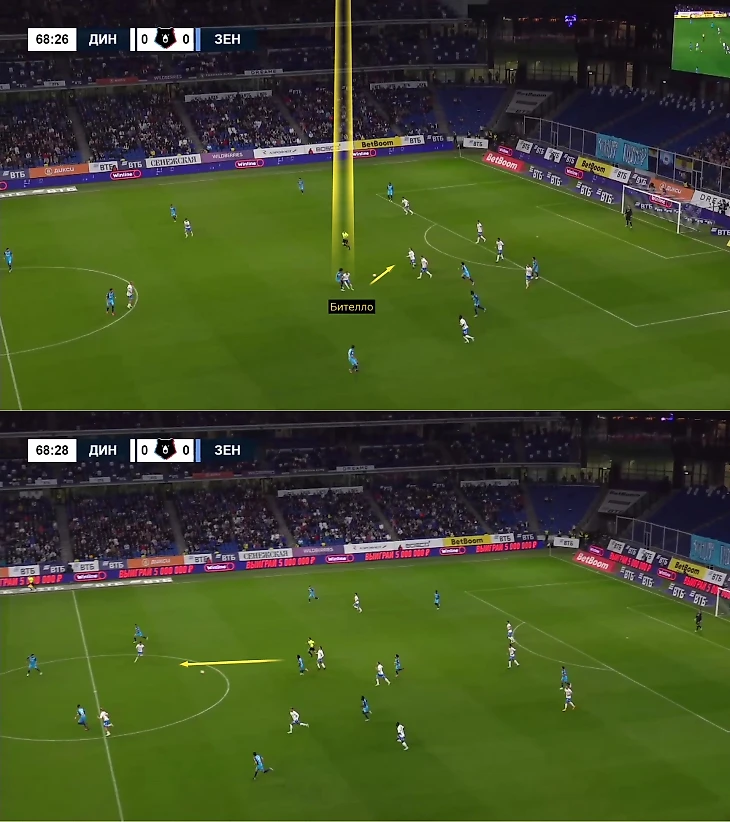 Размен Чавеса на Бителло – снова большой риск. Изначально казалось, что Личка сохранит 4-3-3: тогда второй восьмеркой стал бы Бителло или Карраскаль, которые бесполезны при массированной обороне. Но «Динамо» перешло на 4-4-2, где Бителло – десятка в паре с Тюкавиным. Тоже неожиданно, ведь хозяева оставляли двух полузащитников против Барриоса, Вендела и Клаудиньо, к которым в середине присоединялся Артур.
