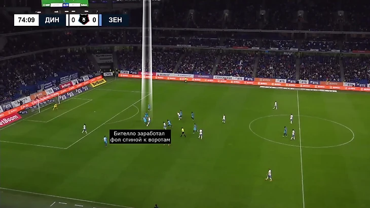 2. Смутил Барриоса, вынудив обыгрывать Нгамале в сторону ворот, из-за чего «Зенит» потерял мяч. Через несколько секунд гости его вернули, но Михаил Кержаков под давлением вынес Лаксальту. Вторым темпом Бителло вынырнул перед Нино для подыгрыша Карраскалю – так «Динамо» заработало победный штрафной.