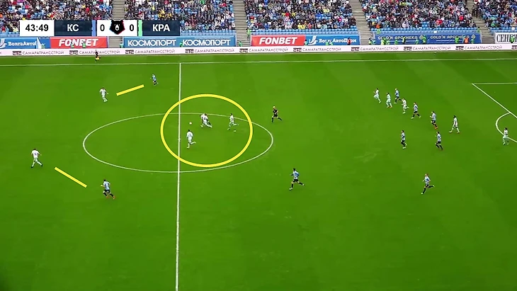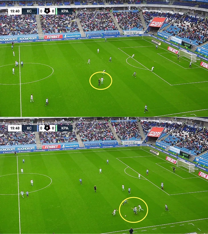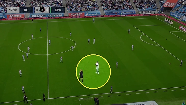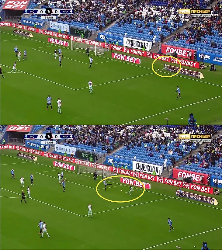 Первое нарушение Волкова – объяснимое. Сергей гасил контратаку «Крыльев»: догнал Никиту Салтыкова и выжимал его в середину. Да, «Краснодар» в большинстве (3-в-1 в центре, Владислав Шитов и Франко Орозко под давлением, Амар Рахманович в глубине, поддержки нет), но опорники чуть позади, партнеры 1-в-1 (могло смущать как раз это).