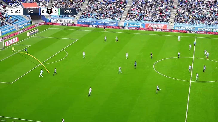 Ситуация не требовала радикального решения – здесь не так опасно, как в конце первого тайма. Да, Черников обрезал «Краснодар», но: а) сзади четыре защитника против атакующей двойки (еще может устремиться Кривцов); б) Салтыков убегал во фланг, а не разворачивался в середину – это менее опасная ситуация; в) скорость Волкова позволяет мгновенно догнать или сбить темп Никиты (и параллельно ждать подстраховку).