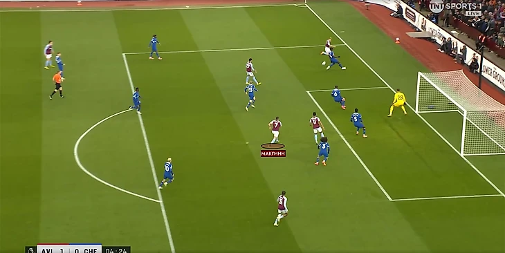 После неудачной атаки, хозяева не успевают перестроится в защиту, и между Уоткинсом и Макгинном создается пространство, которое попутно растягивает Конор Галлахер.