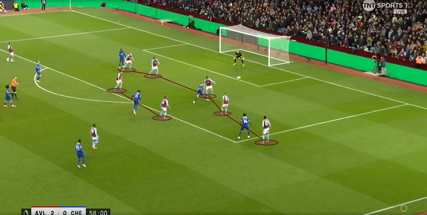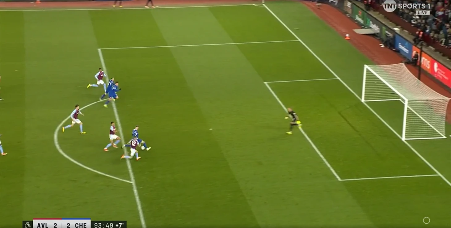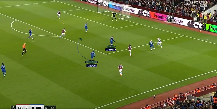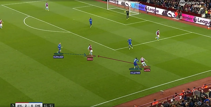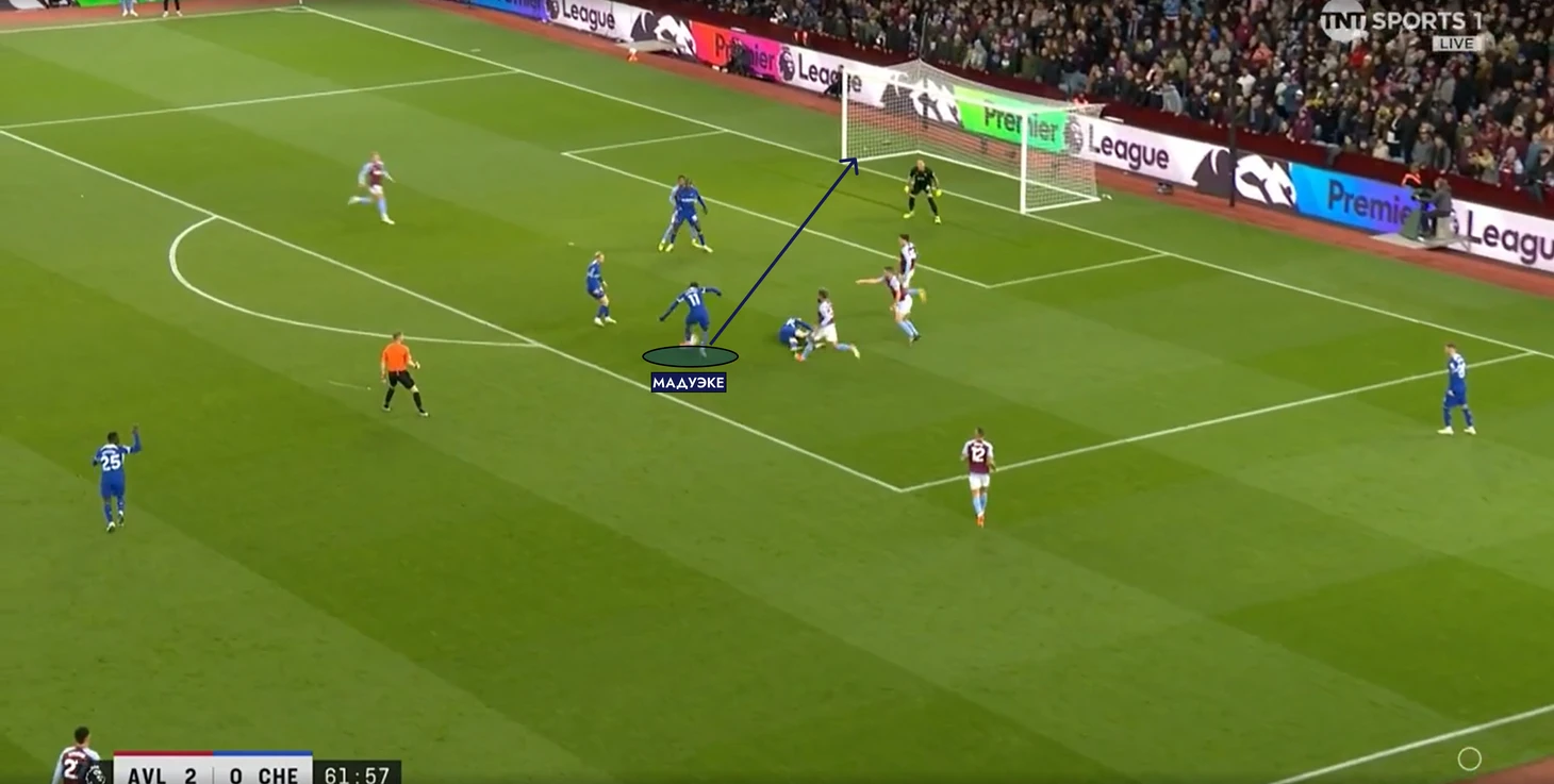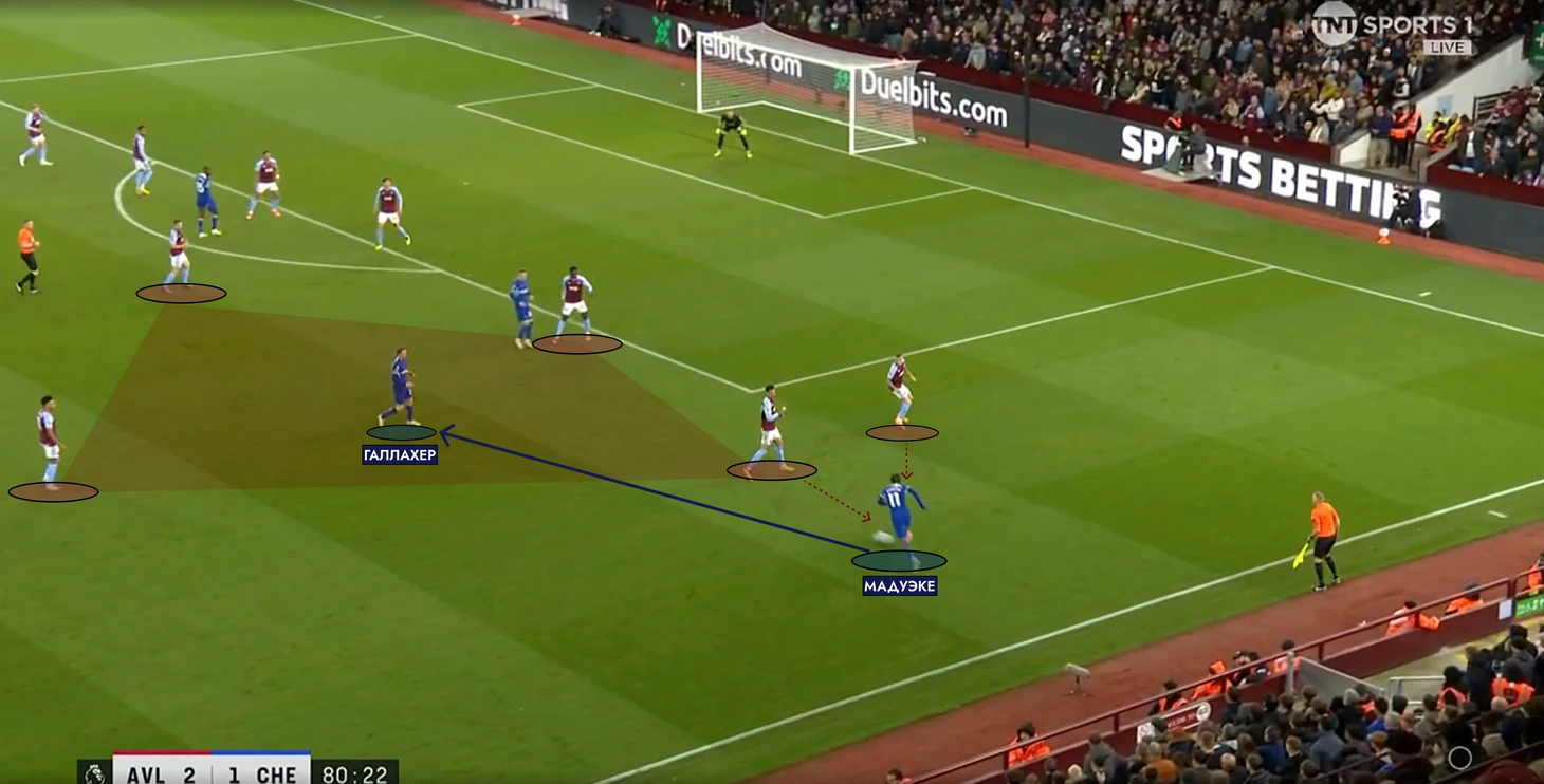 На 80-й минуте Мадуэке тоже оказывает большое влияние на гол – своей активностью в течение игры он заставил двух игроков «Виллы» держаться к нему поближе, открыв пространство для Конора Галлахера.