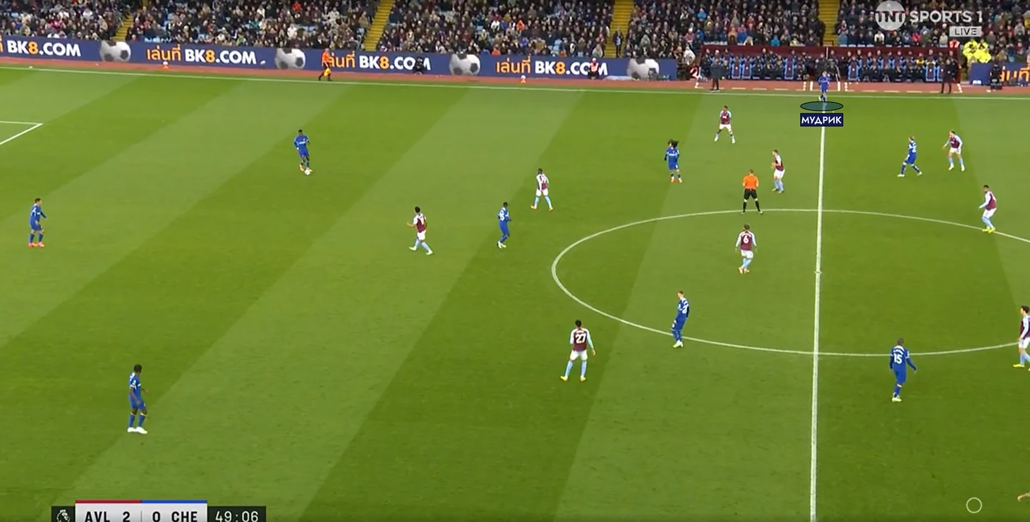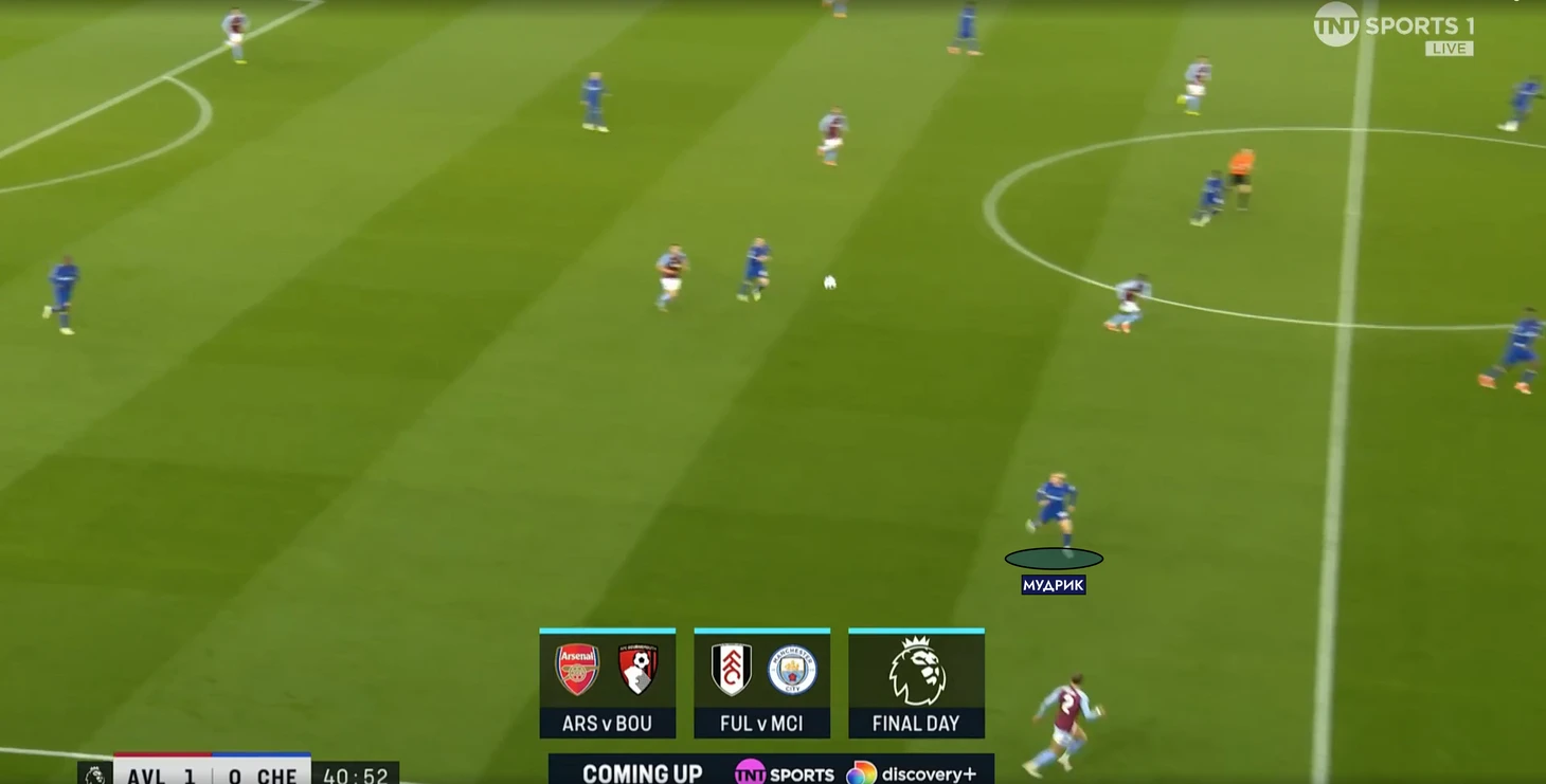 Одна из особенностей атакующей структуру «синих» в первом тайме – это роли вингеров. На скрине заметно, что Михаил Мудрик занимает позицию в полуфланге. Эта возможность позволяла Мише искать мячи у центрального круга и попутно открывать зоны для рывков Марка Кукурельи. Нони Мадэуке создавал ширину в атаке, получая мяч, в большинстве эпизодов, у края поля.