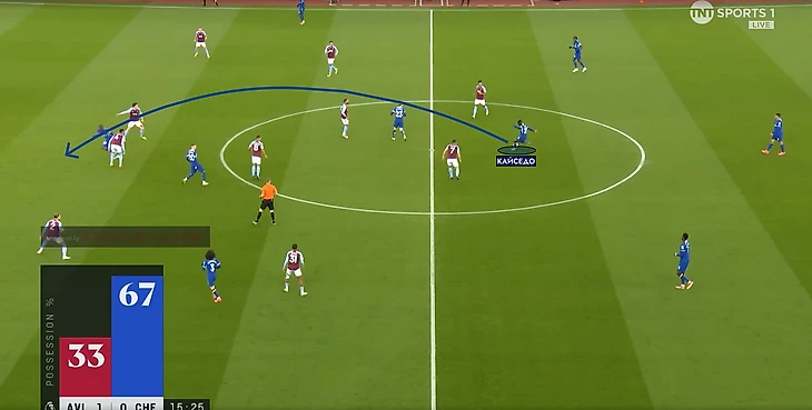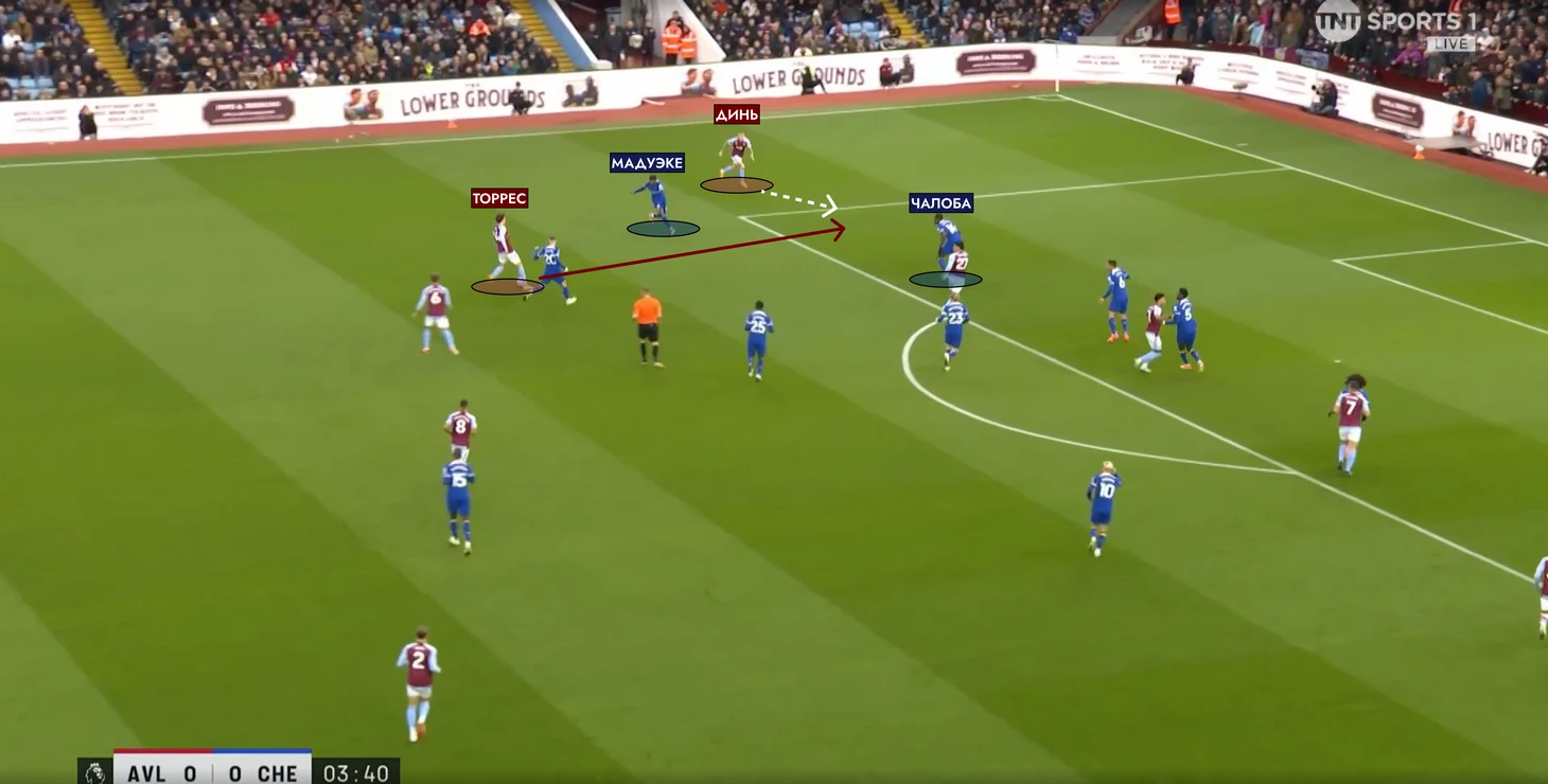 Француз пользуется обоюдной полупозицией Мадуэке и Чалоба (Нони не шибко активно прессингует, а Трево вообще находится в довольно узкой позиции).