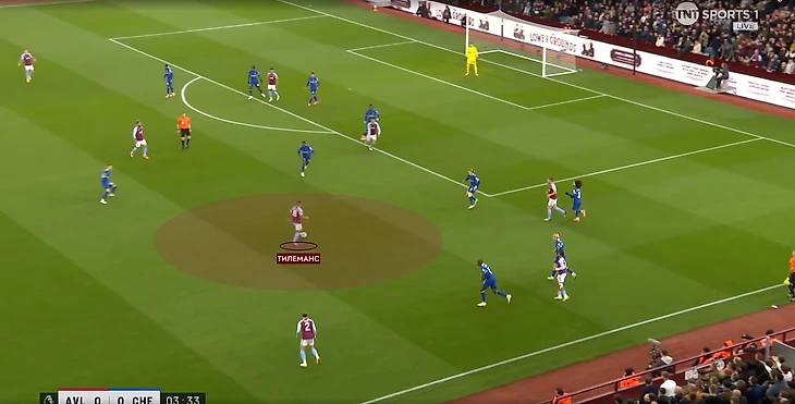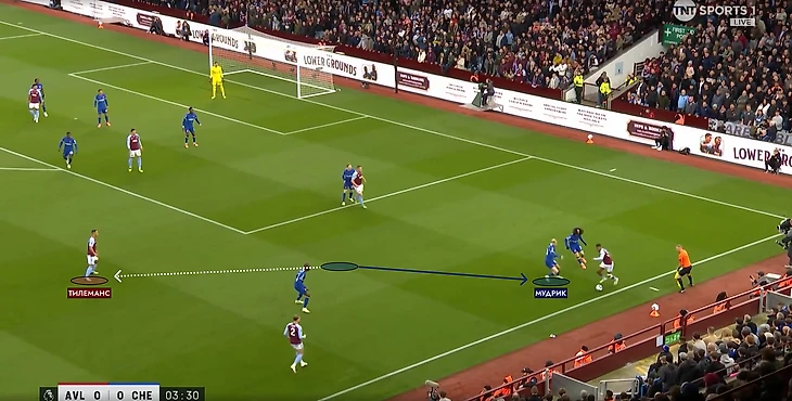 У Кукурельи получается выдернуть Бэйли из штрафной «синих». На помощь испанцу решает пойти Михаил Мудрик, рискованно открывая зону Тилеманса у себя за спиной.