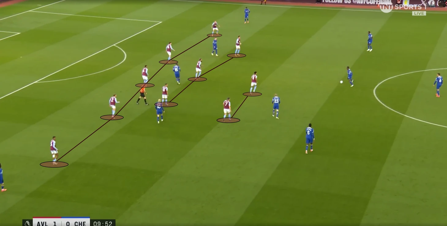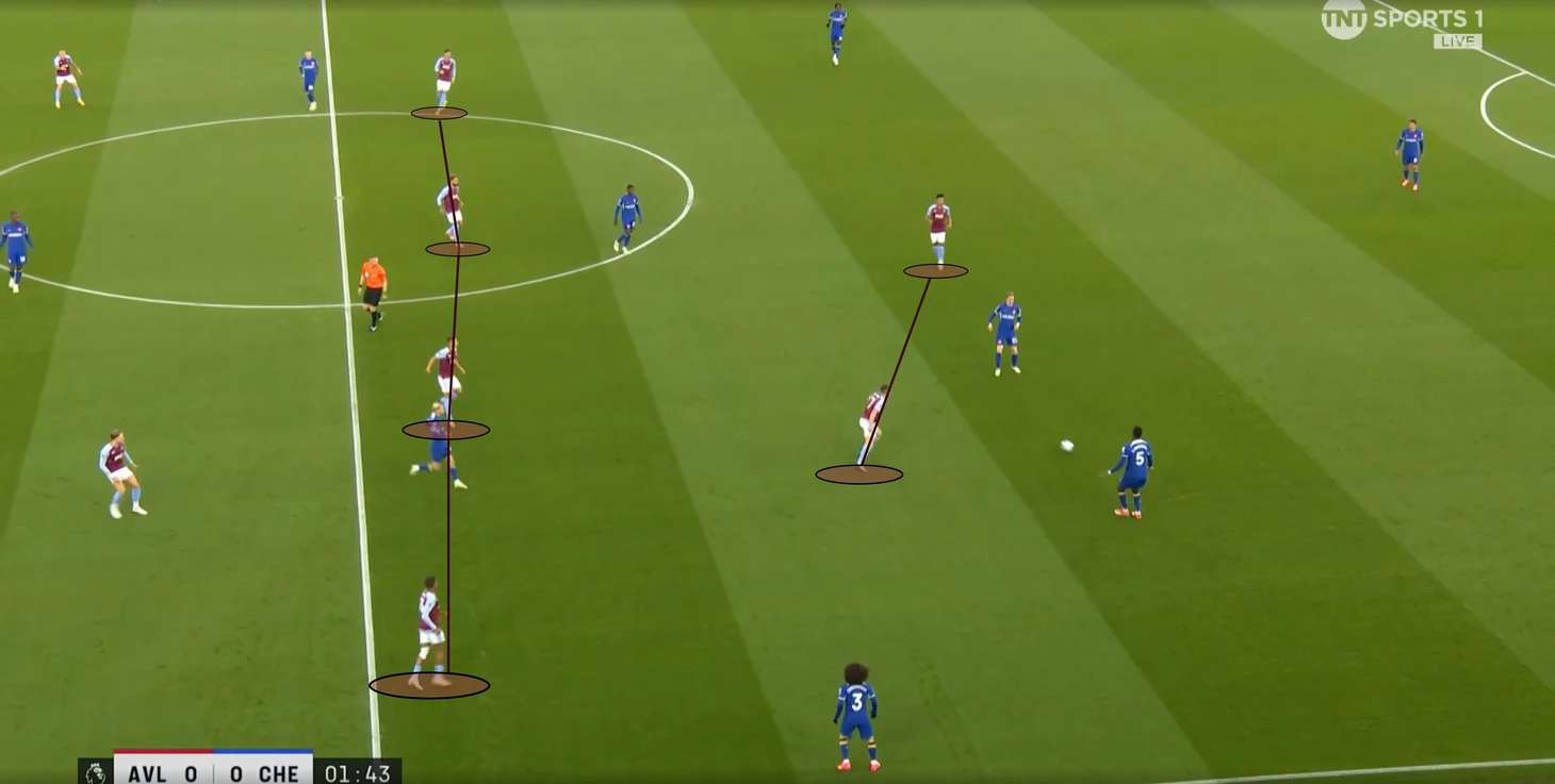 В начале разбора я упомянул, что хозяева играли в обороне по схеме «4-4-2», но это было только в стадиях, где «Челси» владел мячом на своей половине поля. Уже находясь у себя, «Вилла» меняла формацию на «5-3-2», попутно не теряя свою компактность. Отмечу, насколько низко опускался Байли. Такая роль досталась ему из-за высокой позиции Марка Кукурельи.