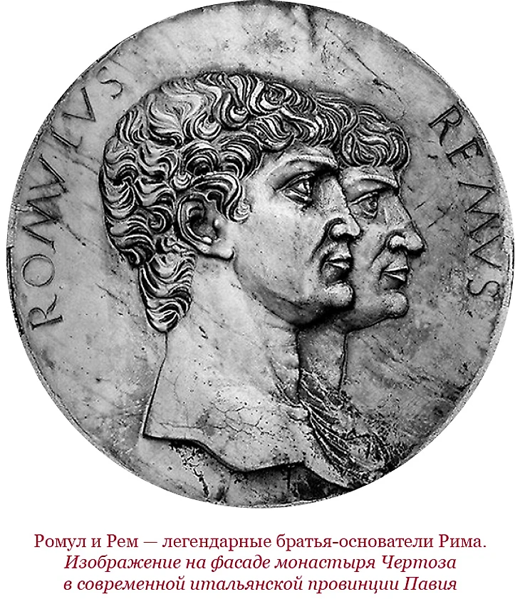 Из рода Энея и вышли основателя Рима. Один из правителей Альба-Лонги, свергнувший своего брата, очень боялся, что его тоже свергнут. Поэтому запретил дочери свергнутого правителя, и по совместительству своей племяннице, иметь детей. Правда у нее все равно родились близнецы Ромул и Рем. По одной из версий от бога войны Марса. Царь приказал бросить детей в реку Тибр. Но река их не приняла, она лишь отнесла корзину с младенцами к одному из холмов. Мальчиков нашла и вскормила своим молоком дикая волчица, обитавшая в тех местах. Повзрослев и окрепнув братья свергли узурпатора, а на трон Альба-Лонги вернули своего деда.
