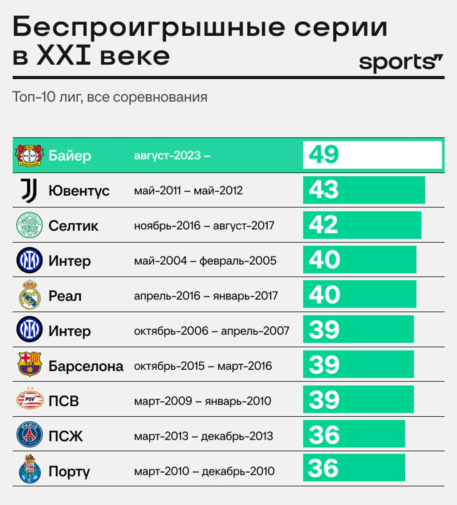Важное уточнение: обе команды выдали такие серии в эпоху до еврокубков. Так что достижение «Байера» уже уникальное.