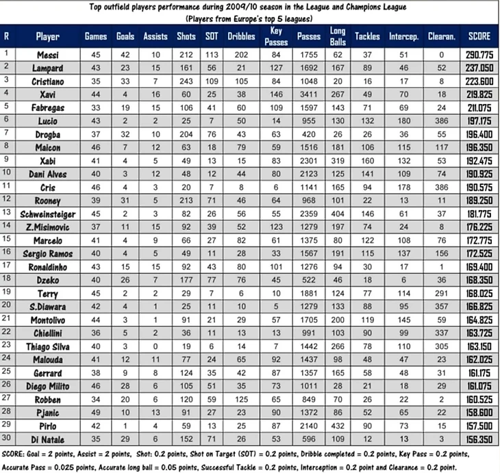 Все мы знаем, что крутость Тони Крооса не измеряется числом голов или ассистов. Но есть один статистический компонент, в котором ему нет равных в мире на данный момент, а тем более на таком уровне - это точность передач. Хави задал бешеную планку в плане роли и функционала центрального хавбека, однако Тони - единственный, кто смог максимально приблизиться к именитому испанцу по статистическим показателям. Также он установил уникальное достижение: стал первым в истории футболистом, чья точность передач на протяжении 10 сезонов не падает ниже 90%. А еще напомню, что немец провел больше всех игр в плей-офф ЛЧ за эти 10 лет, регулярно доходя до полуфинала или финала турнира. Можно еще долго петь хвалебные дифирамбы в адрес Крооса, но мы сейчас оцениваем его реальные переспективы на получение «Золотого мяча». Для этого мы вспомним , как «прокатили» мимо этой награды Хави в 2010, и гениальный 2018 в исполнении Луки Модрича. Конечно, ни он, ни Месси не выиграли в том году ЛЧ, споткнувшись в 1/2 об «Интер» Жозе Моуриньо. Аргентинец же вообще получил вместе со своей сборной в 1/4 Мундиаля 0:4 от немцев, что по мнению многих, отбрасывало его от победы в борьбе за индивидуальный приз. Можно упоминуть Уэсли Снэйдера, однако как можно признать лучшим футболистом мира игрока, который не являлся лучшим даже на своей позиции? На фото сводная таблица от метрики, где указаны все основные футбольные компоненты и суммарные баллы игроков в сезоне 09/10.