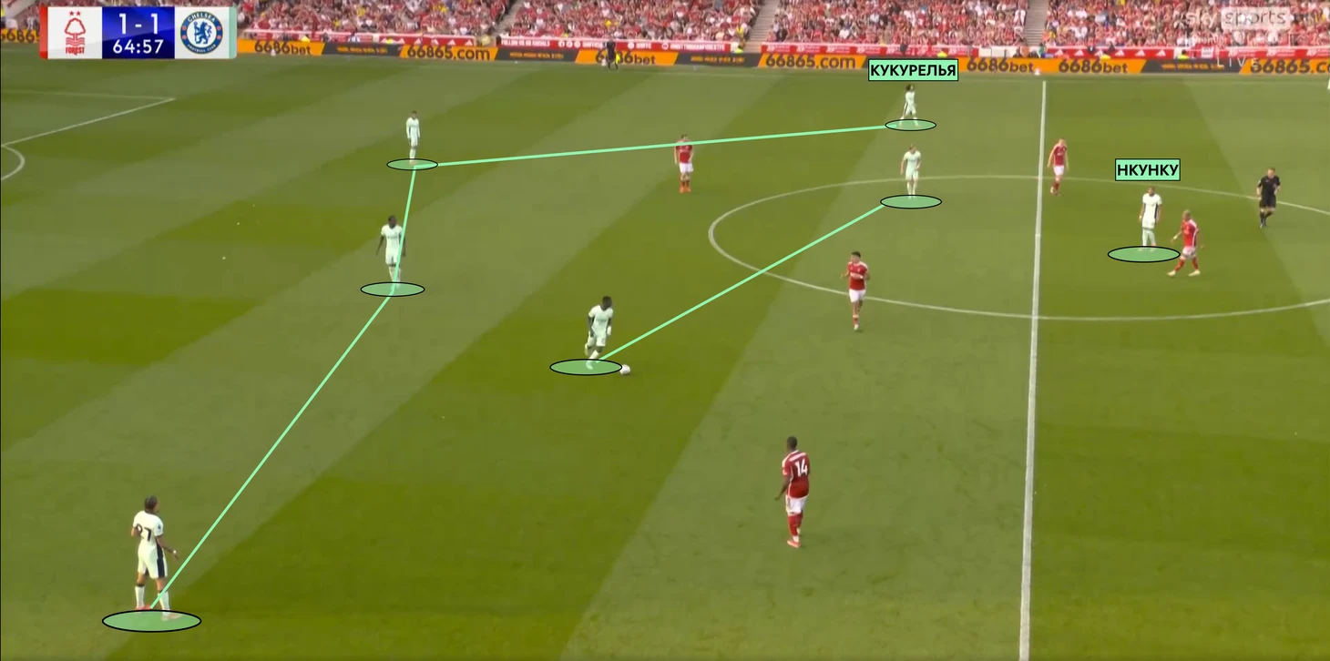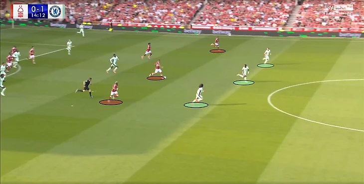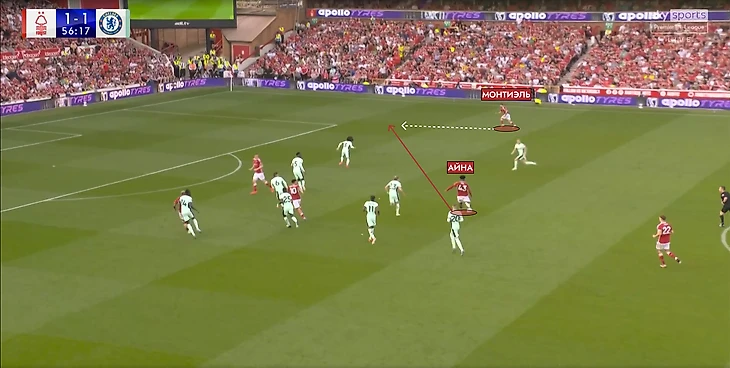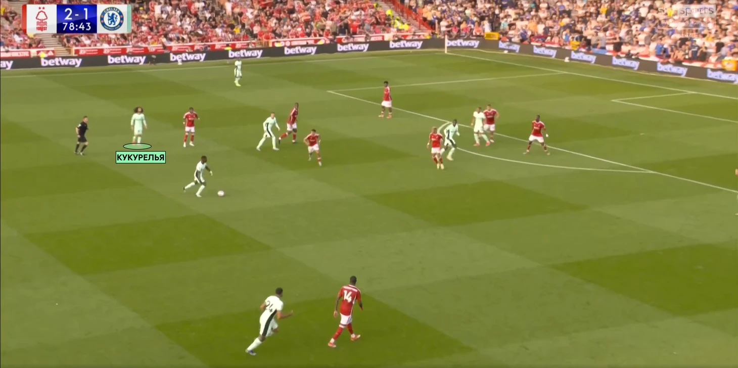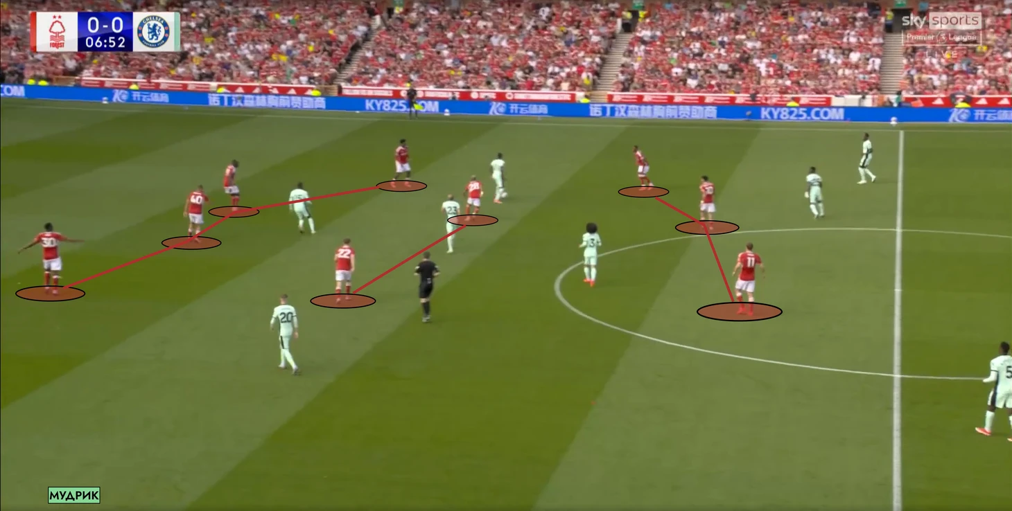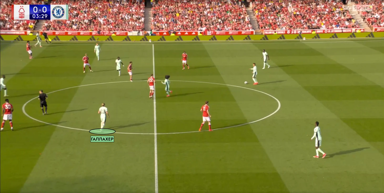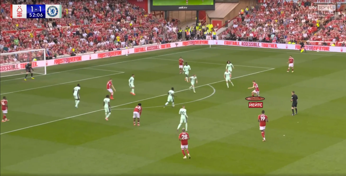 Такой откат к базовой схеме «4-2-3-1» мог позволить немного расширить фланги атак «синих», плюс минимизировать риск контратак – Чалоба и Кукурелья могли подстраховать вингеров, потерявших мяч. Одна проблема – терялось равенство сил в центре поля. «Форест» продолжил сидеть в схеме «5-2-3», которая иногда переходила в «4-3-3» (Айна поднимался в тройку полузащиты), тем самым, продолжая не давать «Челси» проводить атаки через центр поля.