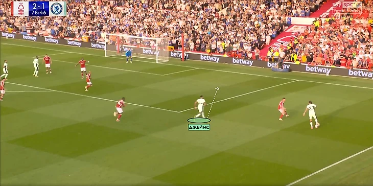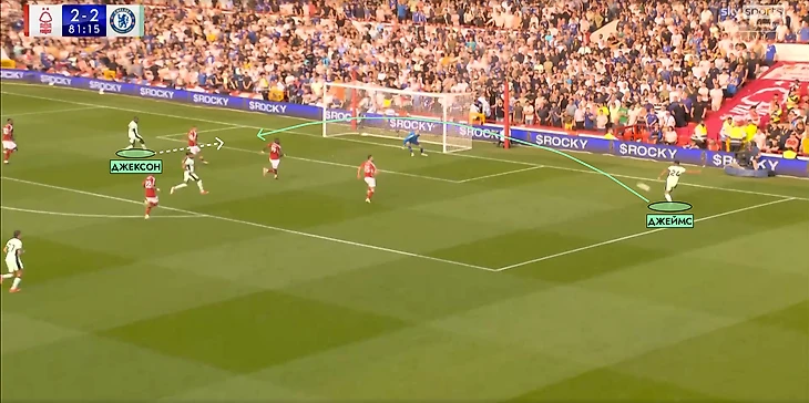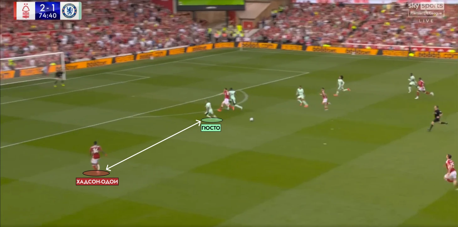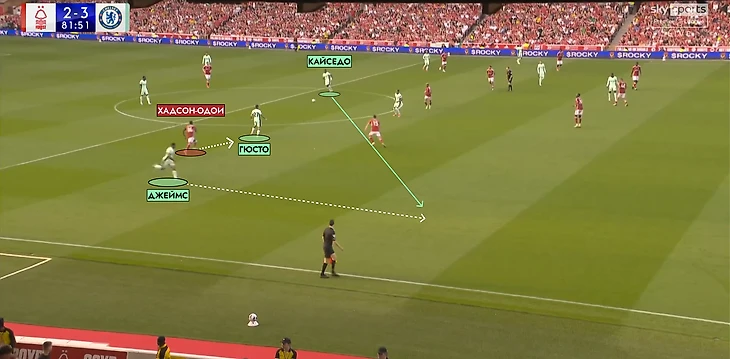 А спустя пару мину мы видим то, для чего и выходил Рис Джеймс. Гюсто, неожиданно, располагается в центре поля, уведя за собой Хадсона-Одои. Вингер «Фореста» оставляет одного Риса Джеймса, в сторону которого и отдаст пас Кайседо.