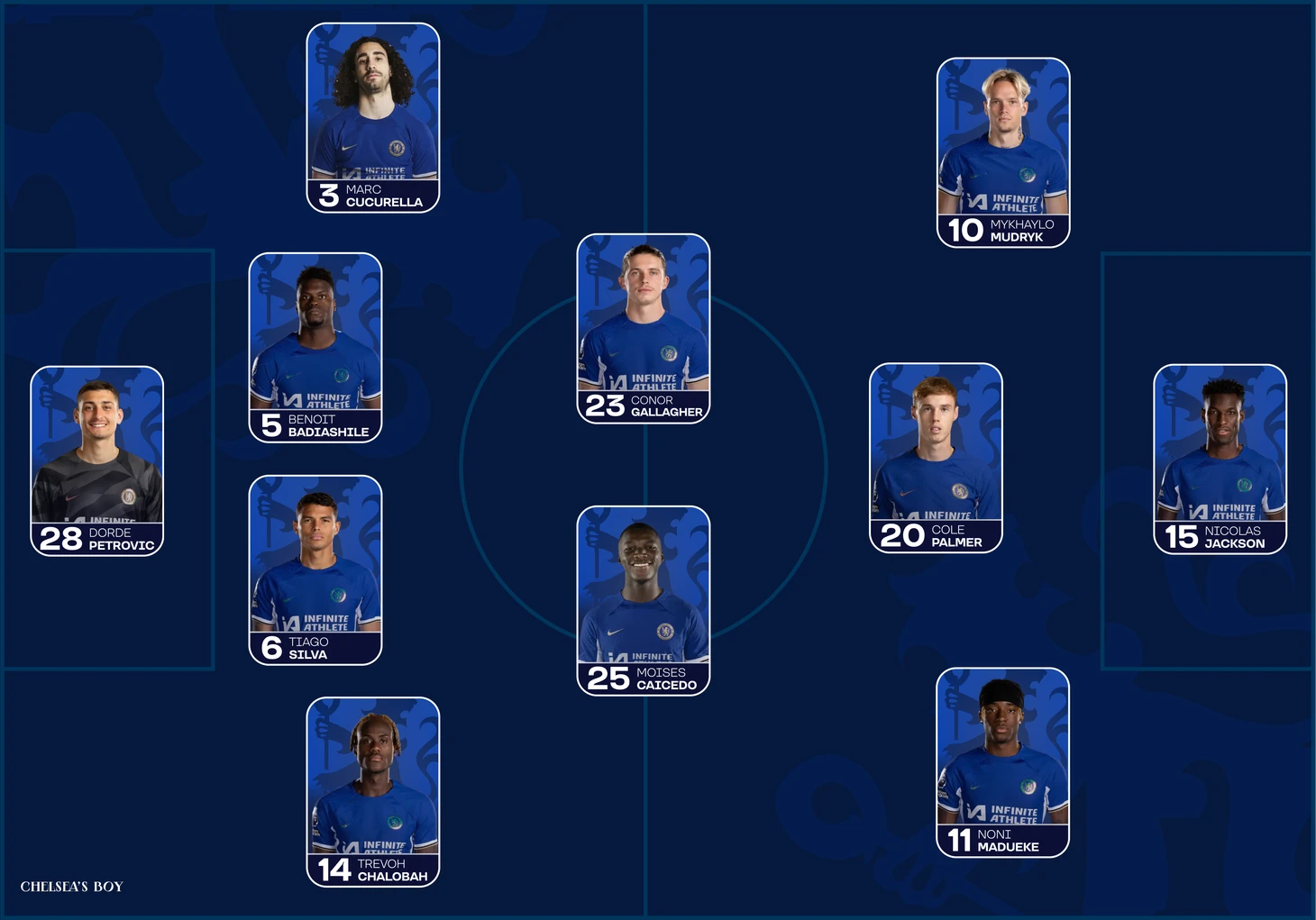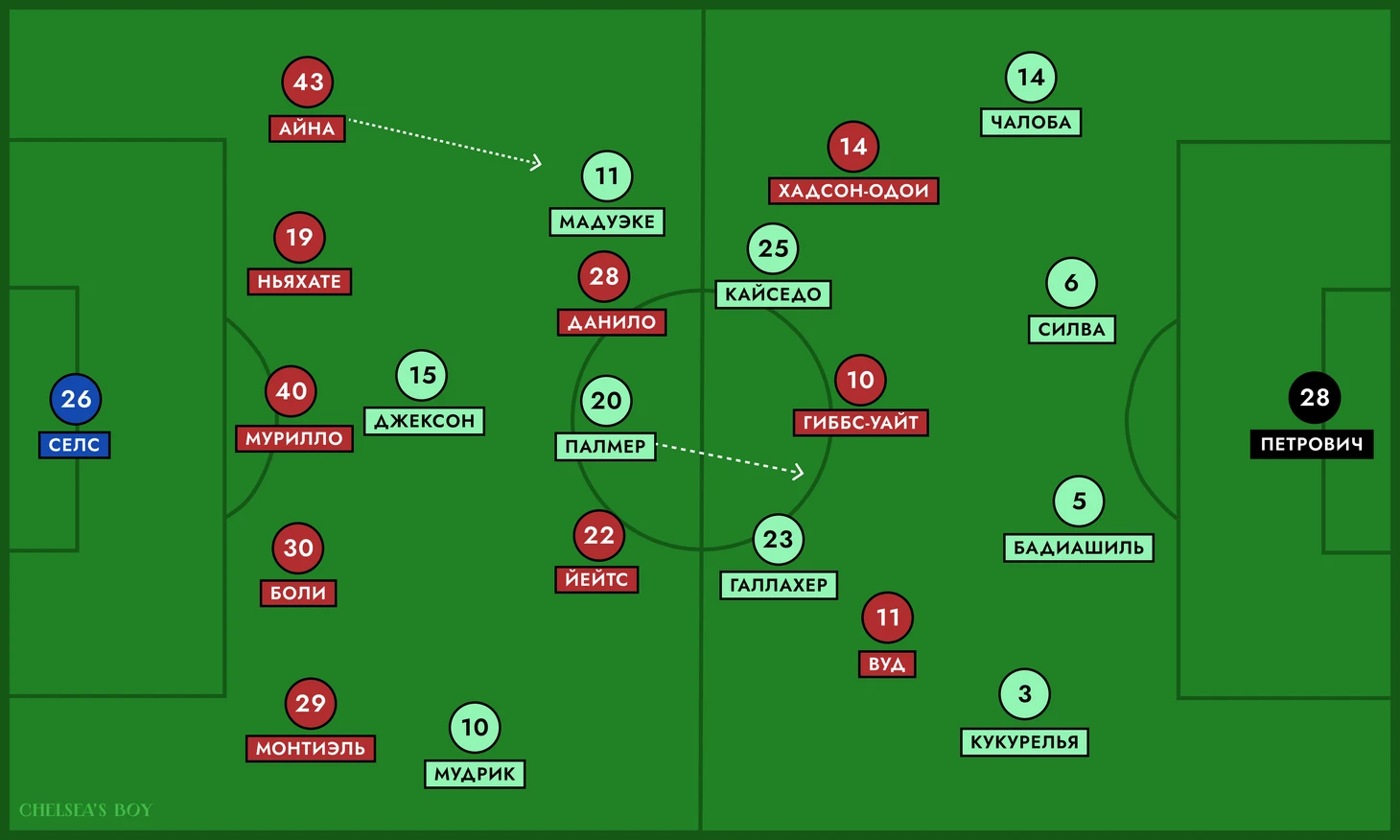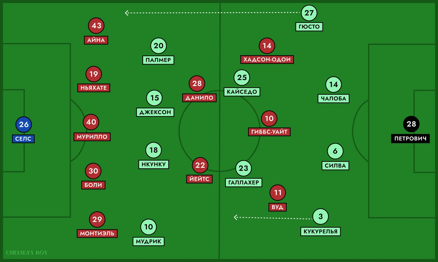 В результате замен, Трево Чалоба вернулся в центр защиты. Коул Палмер перешел на правый край атаки, но все также тяготел к центру, оставляя бровку для забегов Мало Гюсто. Джексон и Нкунку оба хорошо играют в подыгрыше, и без проблем опускались чуть ниже для розыгрыша мяча.