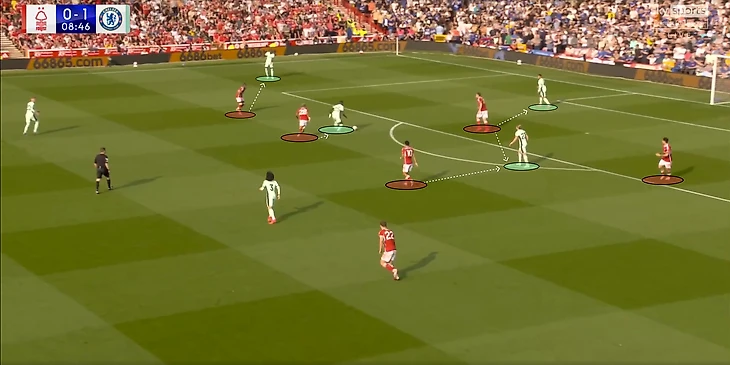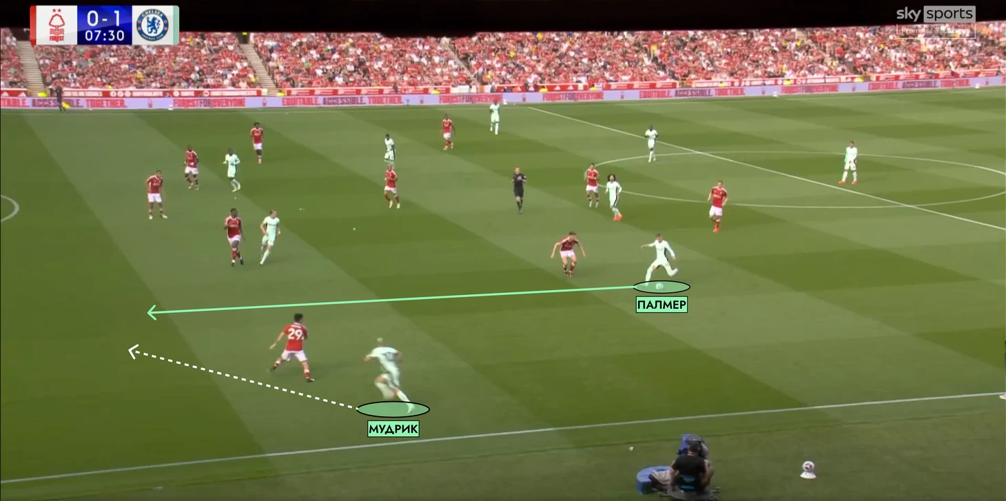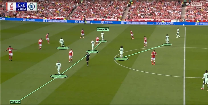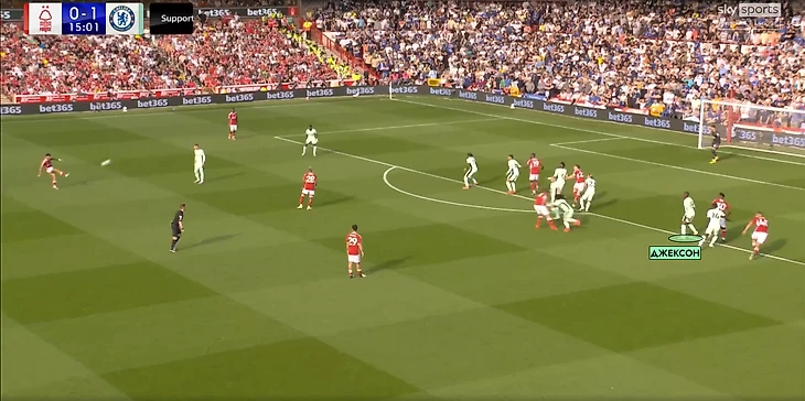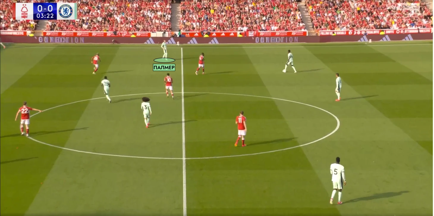 Весь первый тайм «Ноттингем» будет стараться минимизировать пространство в центре поля (где и погорел «Вест Хэм» в прошлом матче с «Челси»). Наглядно это было заметно, когда с фланга в центр, с целью организовать большинство в центре, уходил Нони Мадуэке. Тогда, хозяева выстраивались в довольно компактный блок «5-2-3», полностью нивелируя преимущество «Челси» в средней линии. Такой план и стал катализатором проблем «синих» в позиционных атаках.