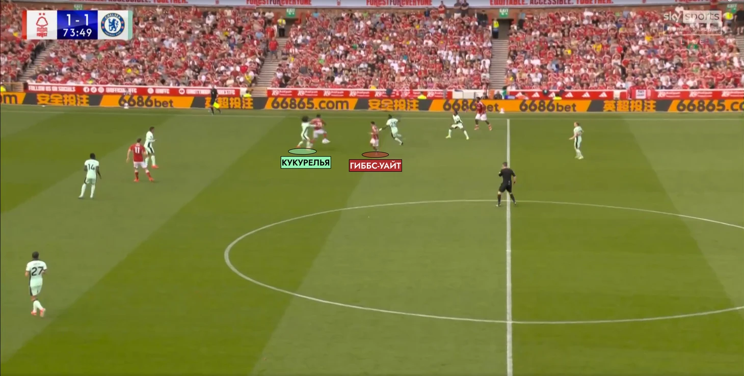 Кукурелья и Мудрик не успевают вернуться на свои позиции – и это косвенно приводит к удару Гиббса-Уайта в штангу с метра, и промаху Вуда с того же расстояния.