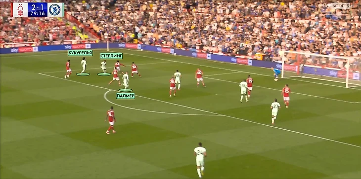 После таких масштабных изменений гол «Челси» не заставил себя долго ждать. Стерлинг сравняет счет, но я бы выделил не только Рахима, но и Кукурелью с Палмером, которые увели за собой игроков «Ноттингема» не дав им бросить все силы на Стерлинга.