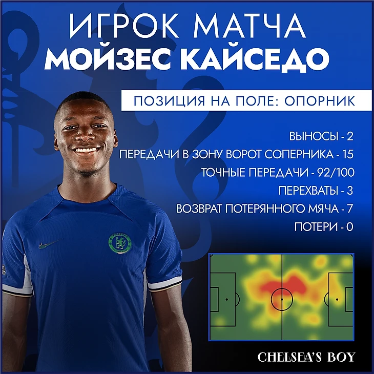 Игроком матча становится Мойзес Кайседо. Эквадорец был полезен во всех стадиях игры – начиная с отбора мяча, заканчивая тонким пасом на Риса Джеймса в эпизоде с третьим голом.