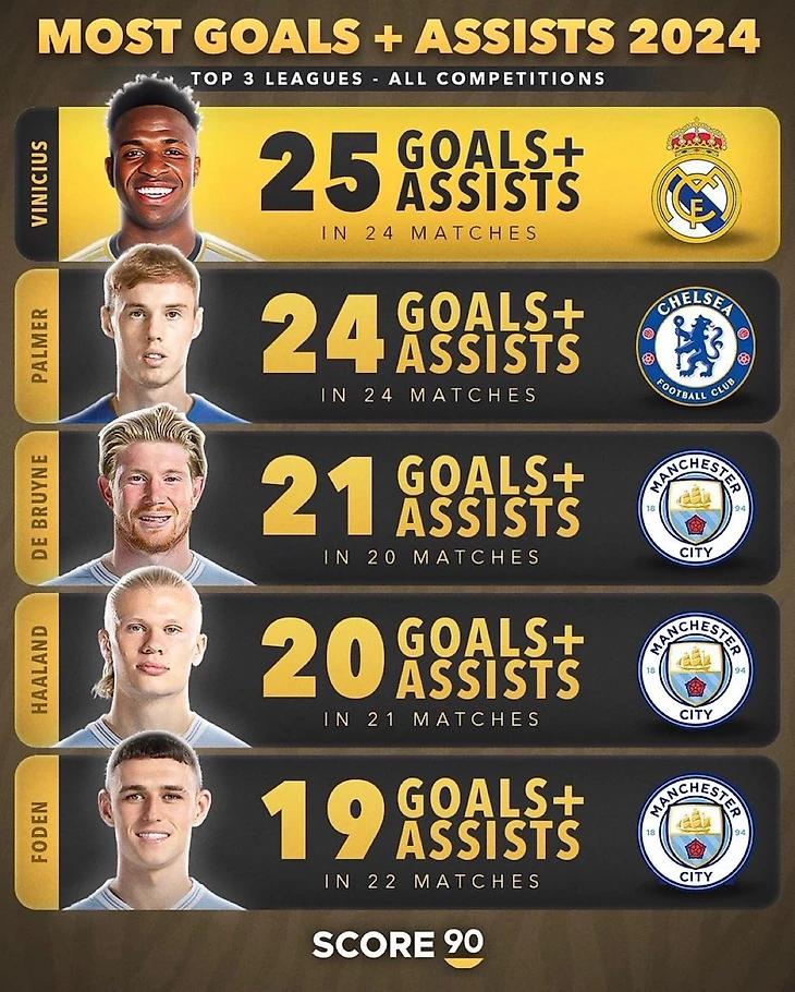 При этом даже в Топ-20 нет полузащитника «Челси» Коула Палмера, но если бы награду выдавали за результативность, то англичанин лишь в шаге от того, чтобы опередить бразильца. После 24 матчей сезона расклад был следующий.