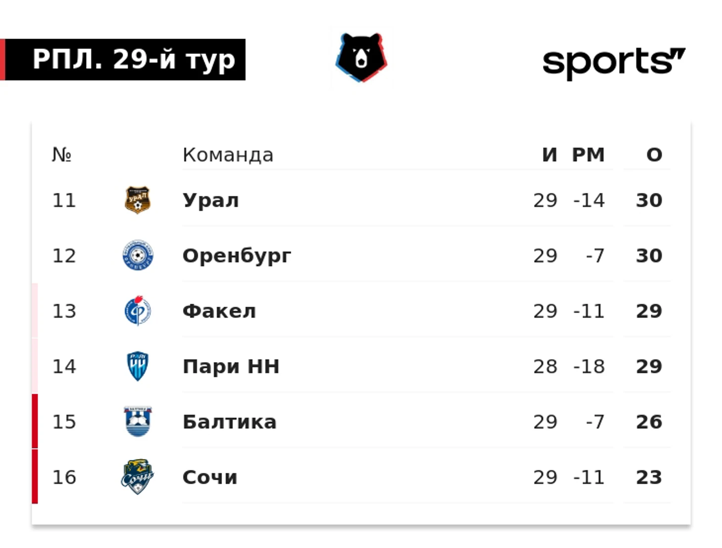 «Урал» и «Оренбург» не вылетят напрямую, им грозят только стыки. Собственные победы обезопасят их точно, обеим командам важно сыграть не хуже «Факела» и «Пари НН» (но нижегородцы могут изменить этот расклад в свою сторону, если наберут очки с ЦСКА).