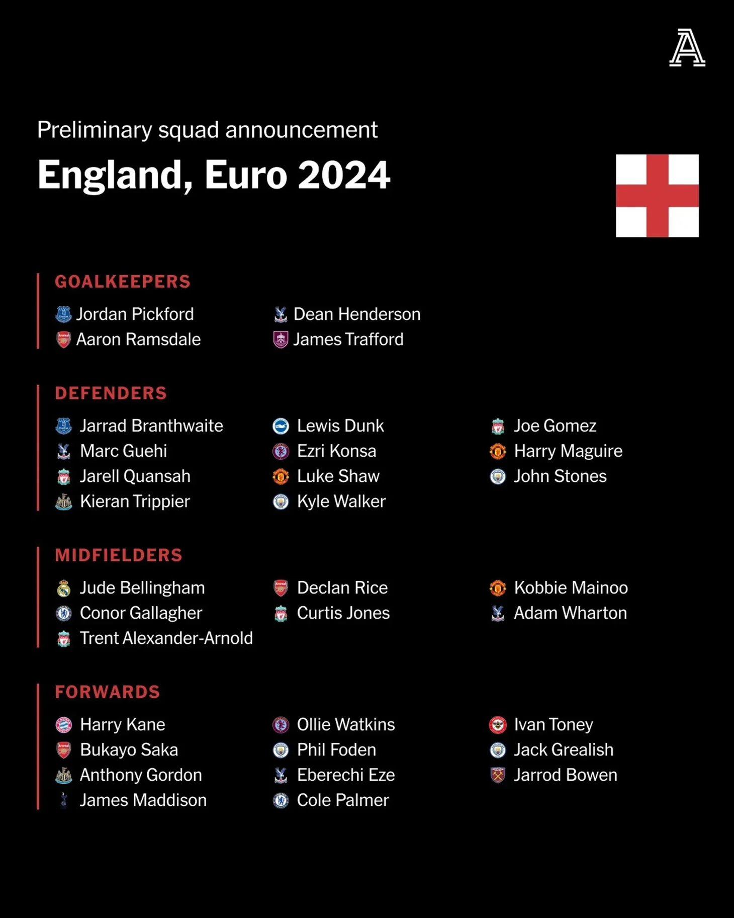 Гарет Саутгейт объявил предварительный состав сборной Англии на чемпионат Европы 2024 года из 33 человек.