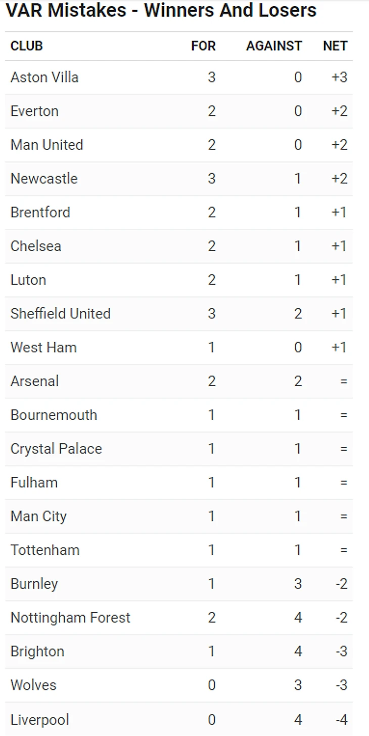 Больше всего проиграл «Ноттингем Форест», которые должны были получить три дополнительных очка, хотя даже с этими баллами они все равно остались бы на 17-м месте. Наиболее заметной была домашняя игра против «Ньюкасла». На 62-й минуте при счете 2:2 в ворота «Форест» должен был быть назначен пенальти, а они проиграли 3:2. Есть все шансы выиграть этот матч, если им назначат и забьют пенальти.