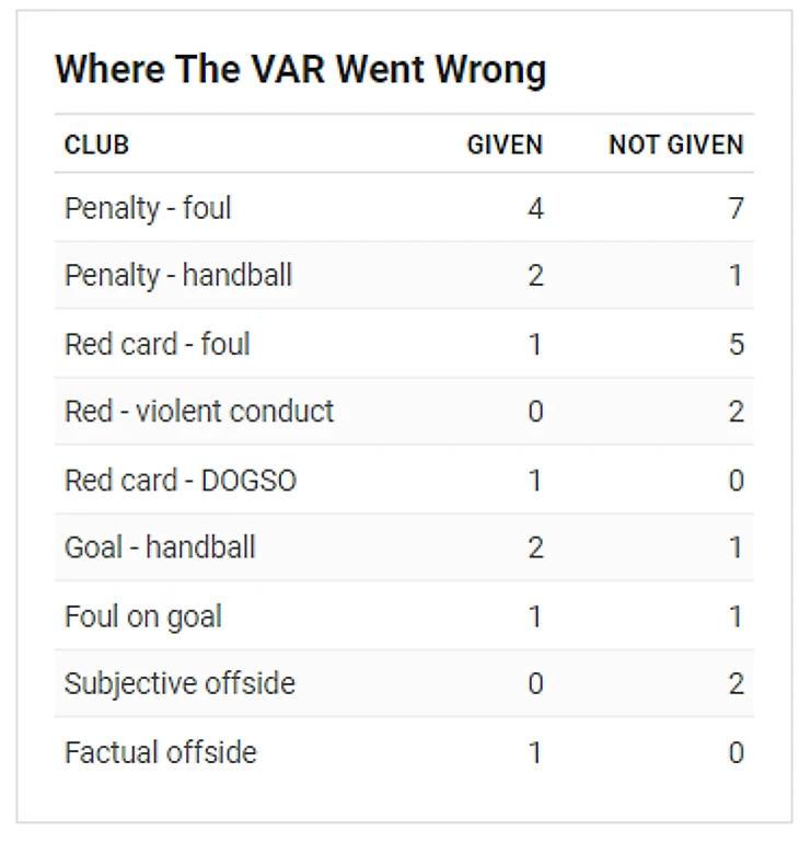 В нижней части таблицы находится Майкл Солсбери, у которого больше одной ошибки за игру: шесть решений, измененных VAR, три, которые должны были быть исправлены, пять ошибок, которые не были явными и очевидными, и одна неправильная вторая желтая карточка.