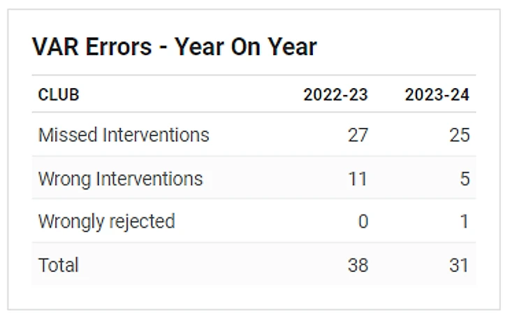В этом сезоне было зафиксировано 112 инцидентов, связанных с VAR, что меньше, чем в прошлом сезоне (120), а в сезоне-2020/21 был зафиксирован рекордный сезонный показатель − 128.
