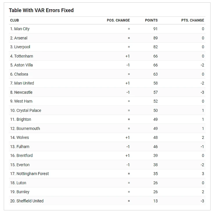 Но самая большая история происходит с командой, которая больше остальных выиграла за счет VAR. После удаления ошибок «Астон Вилла» теряет два очка и опускается с места в Лиге чемпионов на пятое, ниже «Тоттенхэма». У обеих команд становится по 66 очков; разница мячей «Виллы» в реальной таблице составляет +15 против +13 у «Тоттенхэма», но после исправления ошибок VAR и корректировки голов она меняется на противоположную: «шпоры» поднимаются на четвертое место с +16, а Вилла − +9.