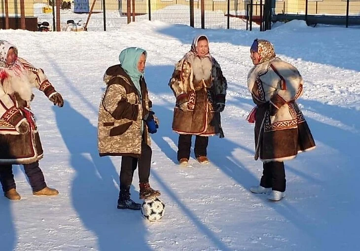 Каждый апрель в минус двадцать пять в честь Дня оленевода в селе проводят женский турнир. У этого соревнования есть одно условие: играть нужно в национальных костюмах, малицах и ягушках.