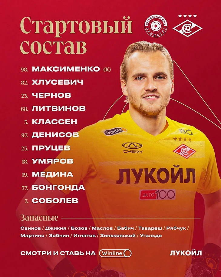 Во втором тайме на 65 минуте на поле вышли: Зобнин, Бозов и Рябчук вместо Классена, Медины и Литвинова.