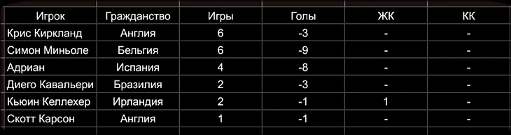 1.АЛИССОН БЕКЕР (БРАЗИЛИЯ) - 46 МАТЧЕЙ, ПРОПУЩЕННЫЕ ГОЛЫ - 47