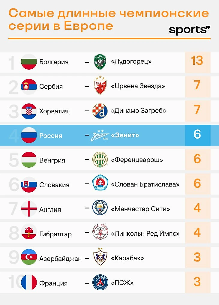 ● «Зенит» – шесть чемпионств подряд, как у «Ференцвароша» и «Слована» из Братиславы.