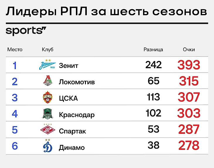«Зенит», очевидно, лидирует по очкам за последние шесть сезонов. А кто за ним?