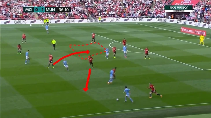 Именно эта задумка и сработала в моменте со вторым голом, вот смотрите, Амрабат свалился на фланг, но тут же Мактоминей закрывает пустую зону марокканца, Майну тоже в своей позиции, что мешает Де Брюйне хорошо пробить, а дальше после выбива мяча, именно Бруну его подбирает, что позволяет развить атаку и как следствие забить гол.