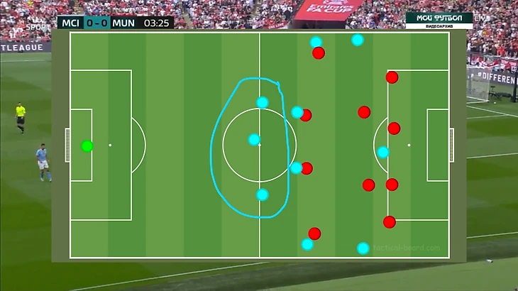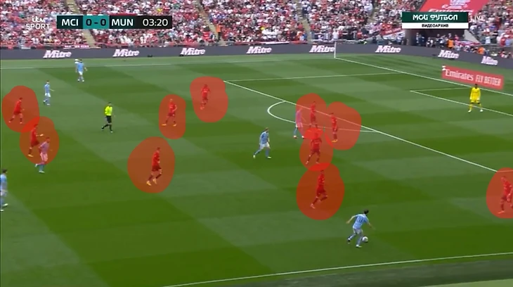 Если Доку обыграет, Гарначо помогает защитнику, а МакТоминей, Майну и на всякий случай Бруну в зоне подбора.