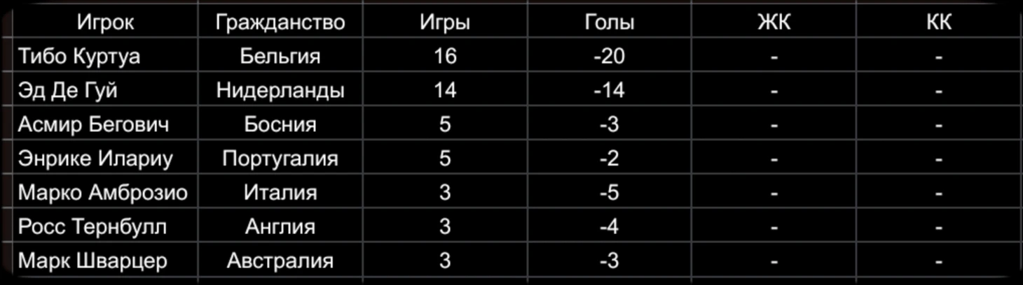 1.ПЕТР ЧЕХ (ЧЕХИЯ) - 94 МАТЧА, ПРОПУЩЕННЫЕ ГОЛЫ - 83, 4 ЖК
