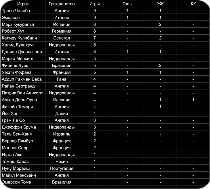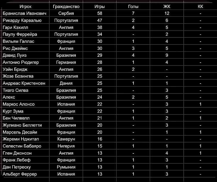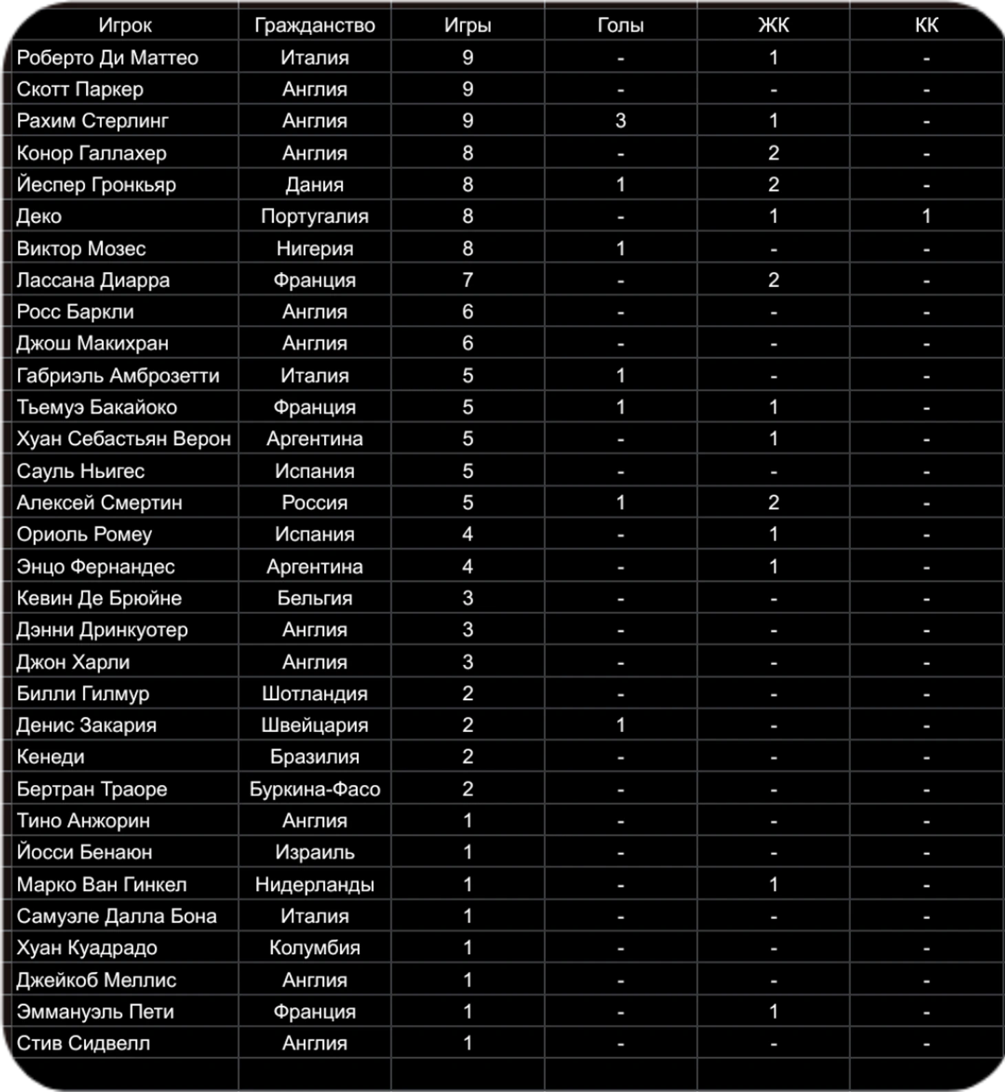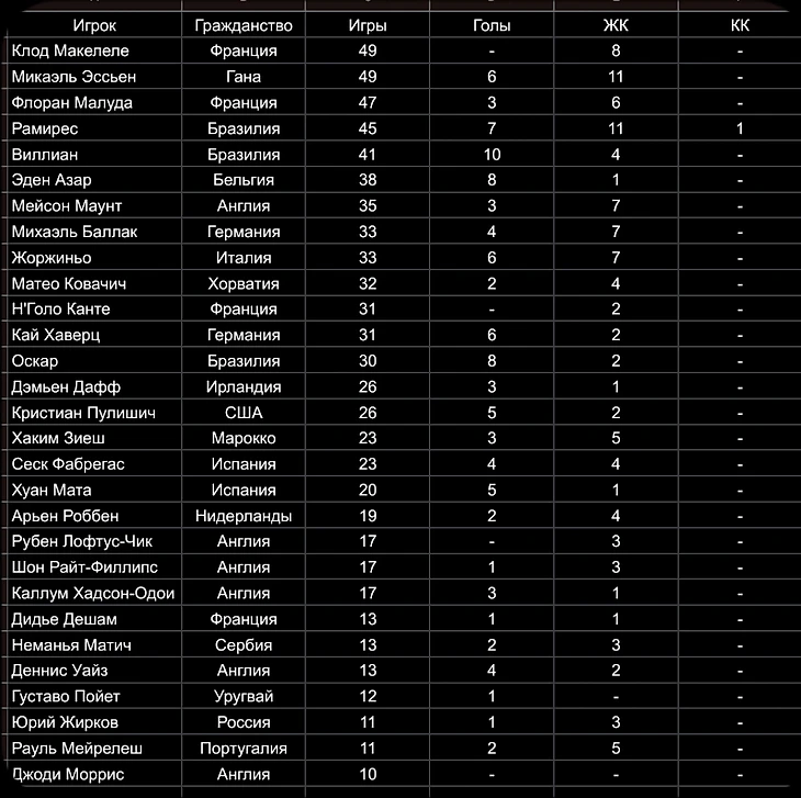 1.ФРЭНК ЛЭМПАРД (АНГЛИЯ) - 102 МАТЧА, ЗАБИТЫЕ ГОЛЫ - 23, 13 ЖК, 1 КК