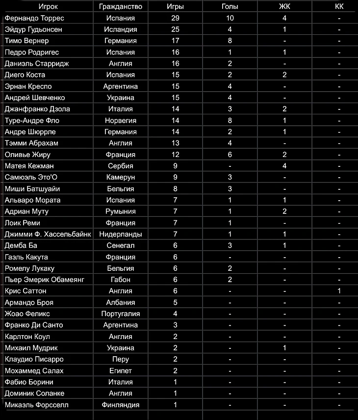 1.ДИДЬЕ ДРОГБА (КОТ-Д'ИВУАР) - 74 МАТЧА, ЗАБИТЫЕ ГОЛЫ - 36, 10 ЖК, 3 КК