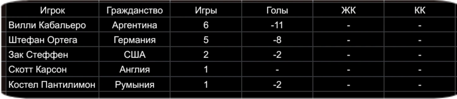 1.ЭДЕРСОН МОРАЕС (БРАЗИЛИЯ) - 68 МАТЧЕЙ, ПРОПУЩЕННЫЕ ГОЛЫ - 58, 5 ЖК