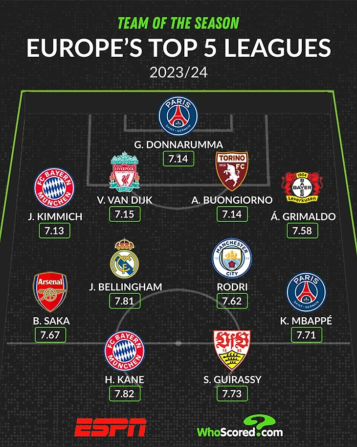Сборная составлялась на основе средней оценки игроков на протяжении всего сезона. Из мадридского «Реала» по такому показателю в команду «отобрался» лишь Джуд Беллингем.