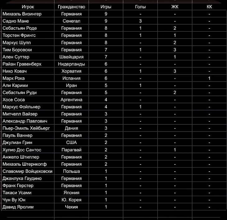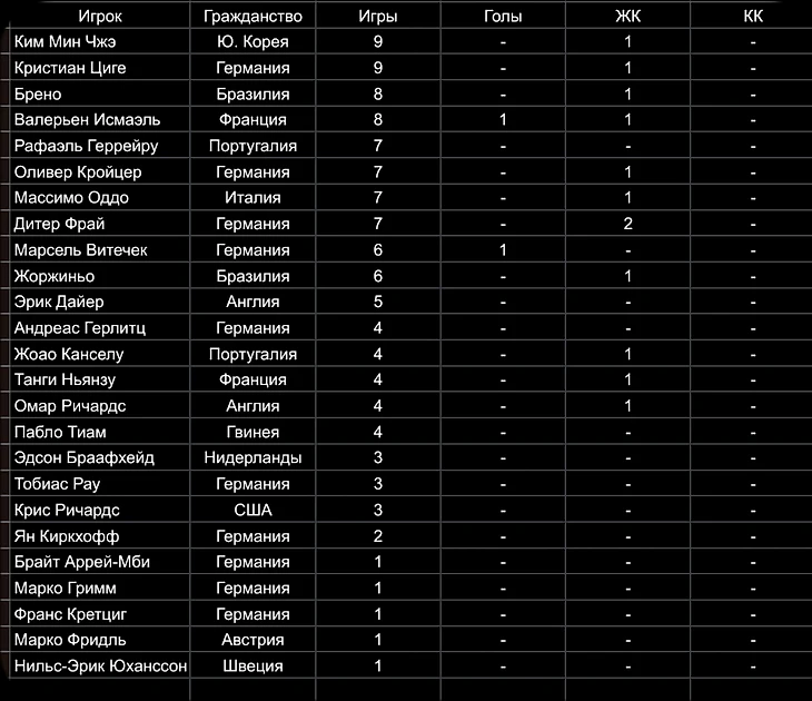 1.БАСТИАН ШВАЙНШТАЙГЕР (ГЕРМАНИЯ) - 89 МАТЧЕЙ, ЗАБИТЫЕ ГОЛЫ - 12, 18 ЖК, 2 КК