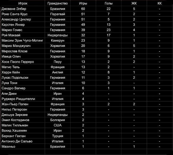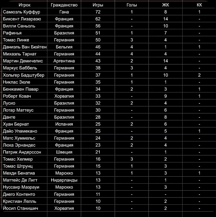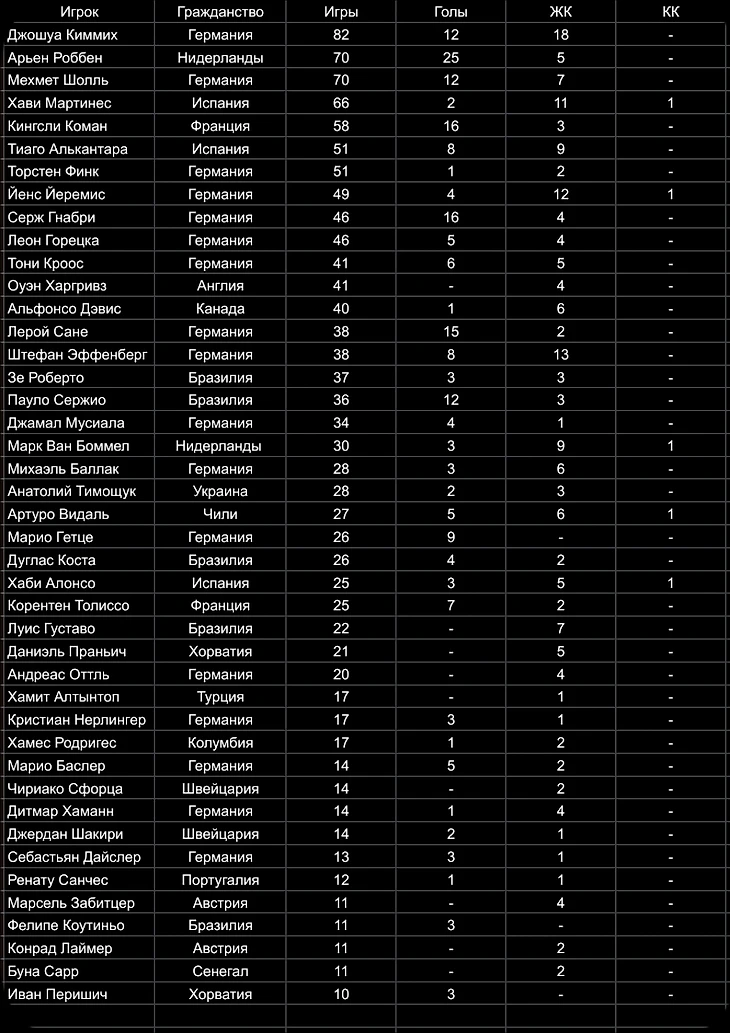 1.ТОМАС МЮЛЛЕР (ГЕРМАНИЯ) - 151 МАТЧ, ЗАБИТЫЕ ГОЛЫ - 54, 8 ЖК, 2 КК