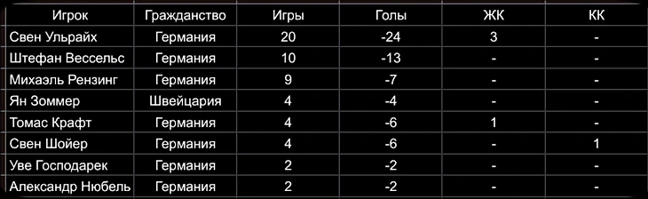 3.ХАНС-ЙОРГ БУТТ (ГЕРМАНИЯ) - 21 МАТЧ, ПРОПУЩЕННЫЕ ГОЛЫ - 26, ЗАБИТЫЕ ГОЛЫ - 1