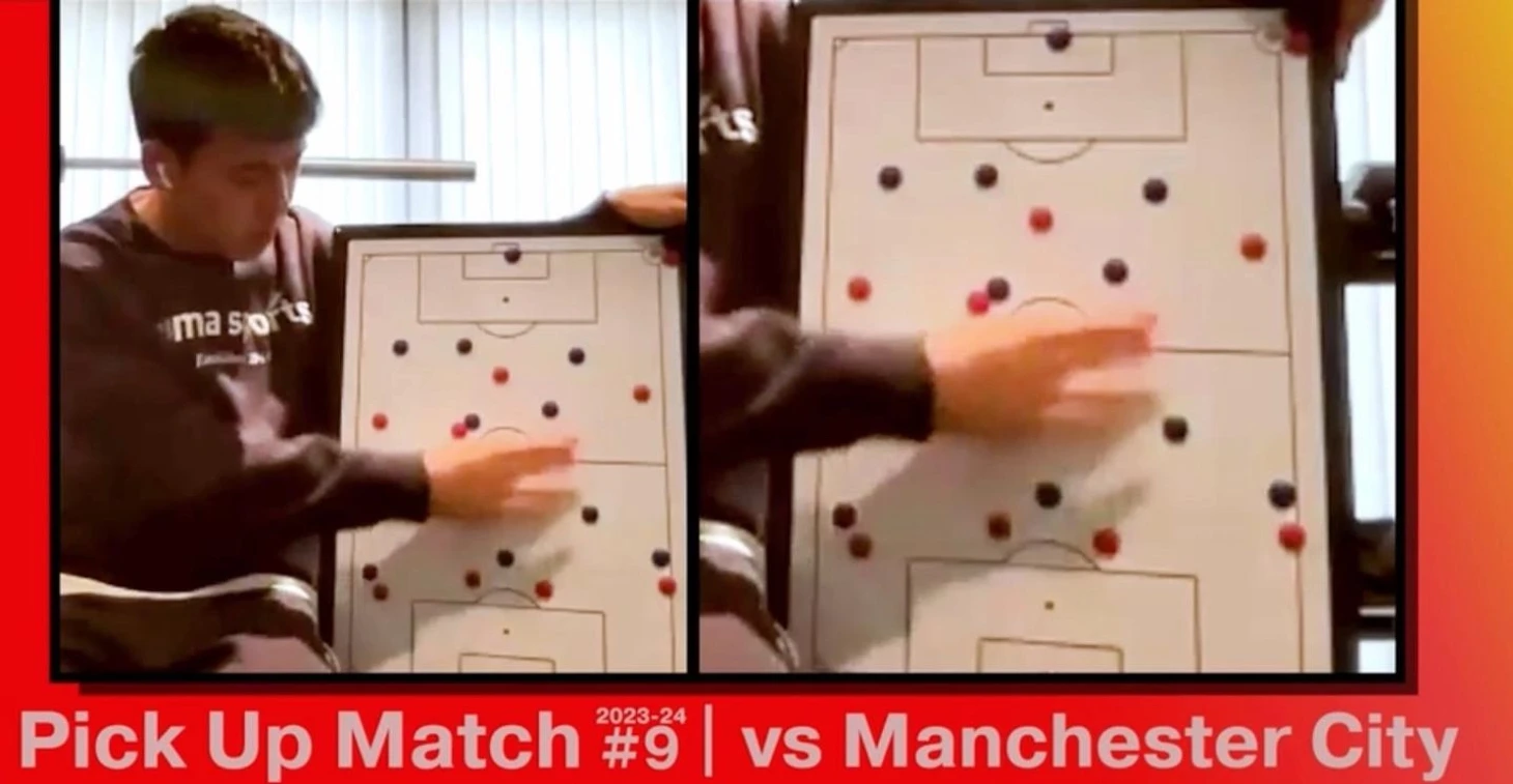 Эндо достает свои магнитные тактические доски, чтобы продемонстрировать изнутри работу матча, в котором он только что сыграл.