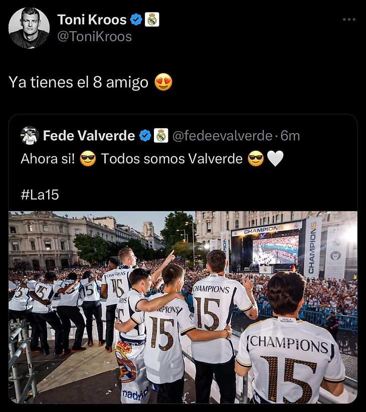 Во время празднования «Мадридом» завоевания 15-го кубка Лиги чемпионов на площади Сибелес Тони Кроос, прощаясь с Королевским клубом, назвал Феде Вальверде своим приемником и заявил о готовности передать ему свой легендарный «8» номер.