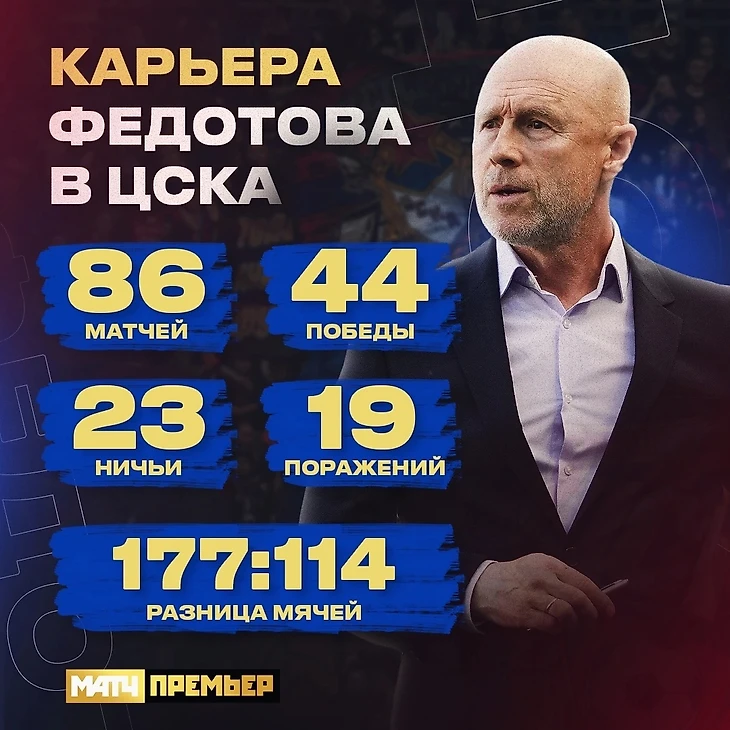 Федотов возглавлял ЦСКА с лета 2022 года. Под руководством 57-летнего специалиста армейцы провели 86 матчей, одержали 44 победы, 23 раза сыграли вничью и потерпели 19 поражений. В сезоне-2022/23 ЦСКА занял второе место в РПЛ и стал обладателем Кубка России.