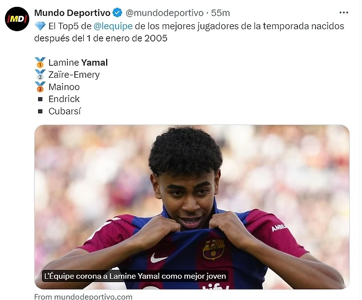 Ранее представители «Барселоны» уже были отмечены изданием L'Équipe: в сезоне 2022/23 лучшим молодым футболистом стал Гави, а в сезоне 2020/21 – Ансу Фати.
