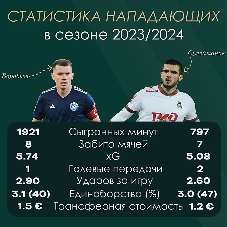 Дмитрий Воробьев одной ногой в «Локомотиве». Президент «Оренбурга» подтверждает факт переговоров по поводу трансфера своего игрока в «Локомотив», председатель совета директоров «Локомотива» подтверждает интерес к нападающему оренбургской команды. Match? Цена вопроса: 2.5 млн евро, контракт кЛуб предлагает на три года. Действующий с «Оренбургом» договор у Дмитрия до июня 2025 года, а согласно ТМ агента у игрока нет. Звучит как оверпрайс, не правда ли? Для «Оренбурга» это последняя возможность продать игрока выгодно, т.к уже зимой можно будет договариваться о переходе игрока свободным агентом. Оправдание здесь только одно — «Локомотив» планирует разбить платежи на несколько лет. Осенью Воробьеву исполняется 27 лет, рост 184 сантиметра, рабочая нога правая. В этом сезоне провел за «Оренбург» 24 матча, два сезона подряд в РПЛ забивает 8 мячей, на каждый гол в этом сезоне приходилось 239 минут, в прошлом 175 минут — отголосок конкуренции с Писарским/Сычевым, а не с Обуховым. Воспитанник «Краснодара», который за ненадобностью быкам отправился в Чехию играть за еду, затем вернулся в Россию пылить в первой лиге и смог найти себя. Поиск себя — ключевое, что нужно знать про Воробьева: по настоятельной рекомендации Галицкого играл на позиции правого латераля за дубль «Краснодара» (вышло неудачно), затем в центре поля, и только в «Волгаре» превратился в стабильного нападающего — 24 мяча в 39 играх и выход с «Оренбургом» в РПЛ (больше него тогда забил только Сергеев). По собственному признанию, лучше всего у него получается играть в центре нападения, остаток этого сезона играл на фланге слева. Решил, что целесообразно сравнивать Воробьева именно с Сулеймановым, так как оба имеют одинаковые антропометрические данные, плохи в позиционной борьбе и контроле мяча, но пользуются своими шансами на поле (статистика ожидаемых и забитых мячей абсолютно идентична).