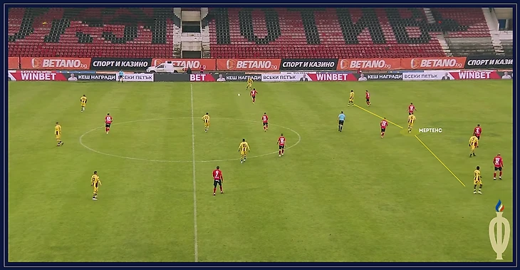 При этом сама команда перестраивалась в 4-4-2/ 2-4-4 c ромбом в центре поля, где Мертенс находился под нападающими. Также отметим, что, играя номинально опорного полузащитника, Дилан за счет грамотного расположения на поле делает ставку, скорее, на перехваты, нежели на отборы — в среднем 1,3 перехвата за игру.