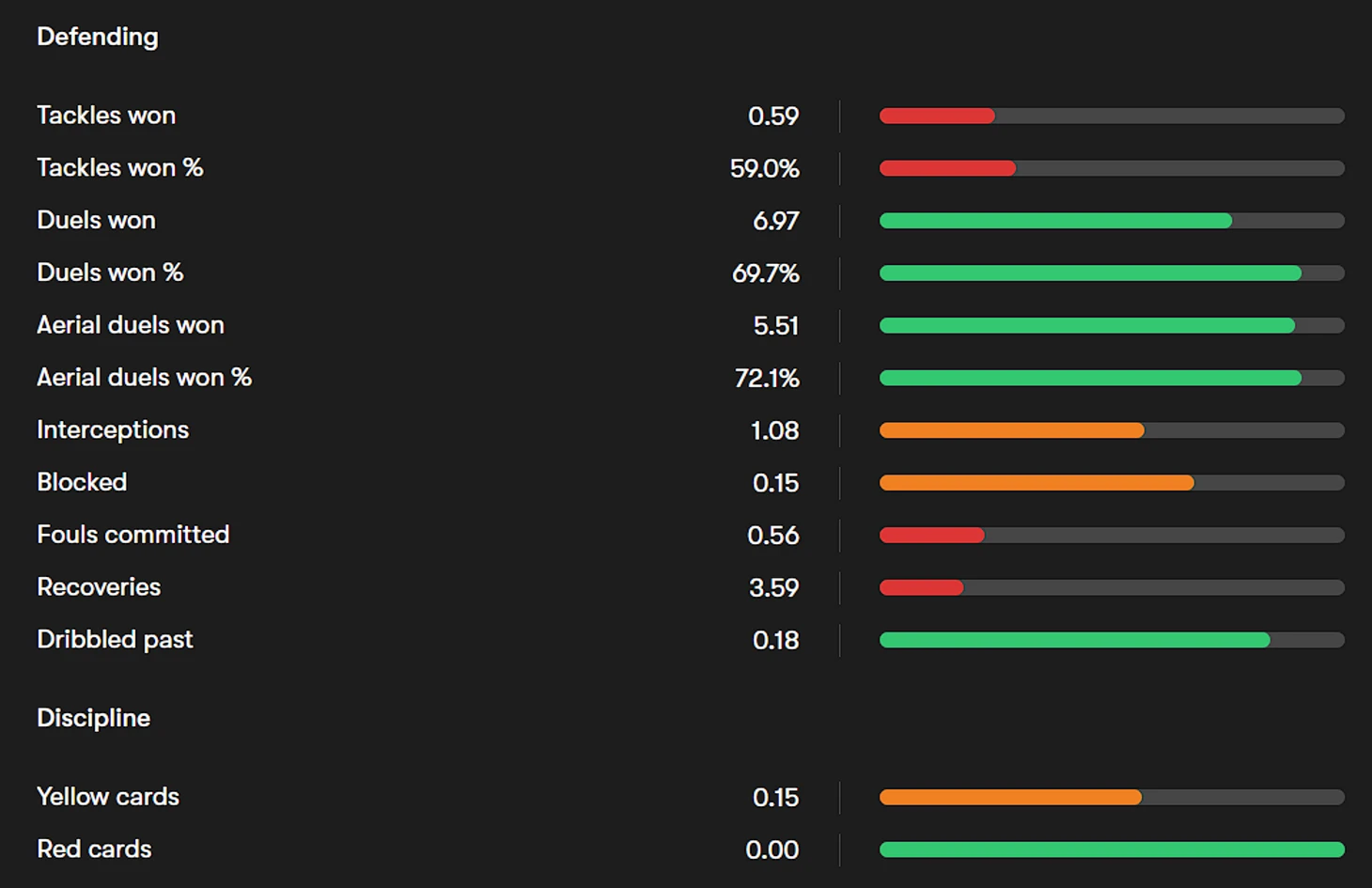 Начнем с его первого паса. Масса хайлайтов у бывших и нынешнего партнеров Мура по центру обороны, но цифры показывают, что сам капитан тоже очень вольготно чувствует себя с мячом. 82% точности передач (40% у лонгболлов) при более 50 попытках в среднем за матч. При этом, Эллиотт чаще, чем кто бы то ни было встречается с мячом, то есть регулярнее находится под прессингом, но почти не теряет при этом владение. Где можно по-настоящему развернуться в пропаганде верховенства Мура, так это в статистике выигранных единоборств. Почти двухметровый рост позволяет ему снимать почти все мячи на втором этаже. Если сложить верх и низ, то победная доля лишь немного проседает ниже 70%. Также о самообладании Эллиотта говорит тот факт, что в прошедшем сезоне он получил только 5 предупреждений.