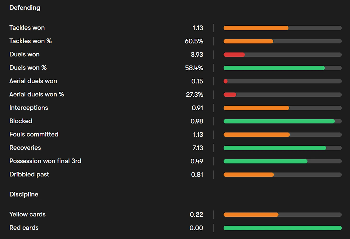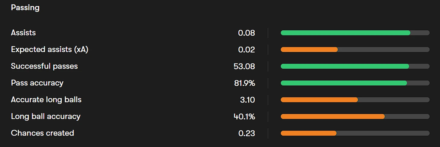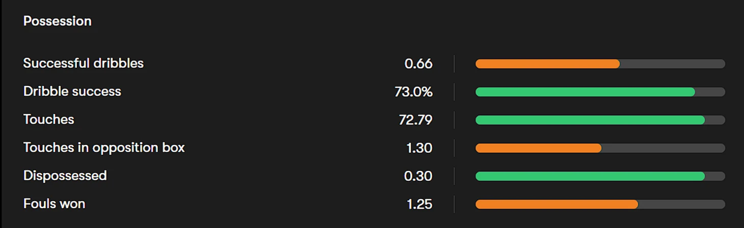 Переходим к более слабым сторонам игры Брэннагана. В его ногах нет скорости, поэтому он неспособен проходить через оппонентов с помощью дриблинга. Доля успешных обводок составляет 73%, но объясняется тем, что Кэм идет на такой шаг реже одного раза за игру – только в случаях высокой уверенности в успехе. Соответственно и нарушения на себе он покупает у арбитров крайне редко – для этого есть быстроногие вингеры вроде Джоша Мерфи или Оуэна Дейла, либо чистые атакующие полузащитники Рубен Родригес и Тайлер Гудрхэм.